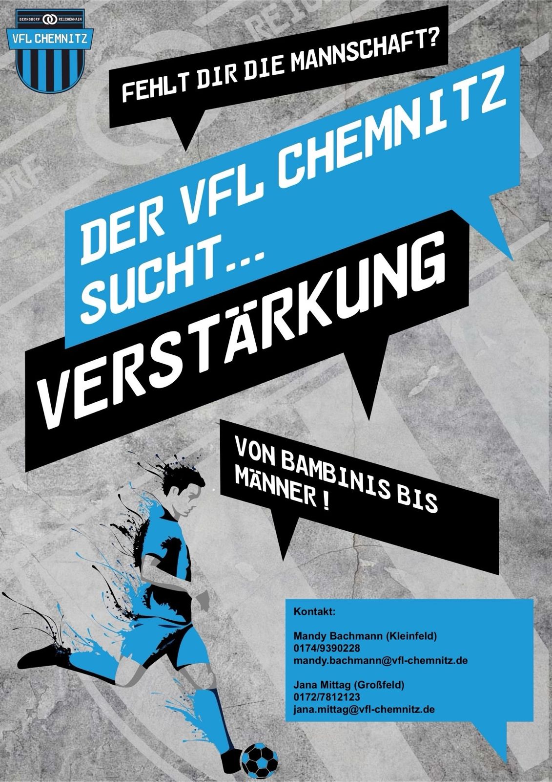 ⚽ Werde Teil des VfL Chemnitz e.V. – Nachwuchsspielerinnen und -Spieler gesucht! ⚽23. August 2024Der VfL Chemnitz e.V. sucht fußballbegeisterte Kinder und Jugendliche, die Lust haben, Teil einer erfolgreichen Nachwuchsabteilung zu werden. Egal, ob ihr gerade erst anfangt oder schon ein paar Tricks auf Lager habt – bei uns seid ihr richtig! Bei uns ist jeder willkommen!